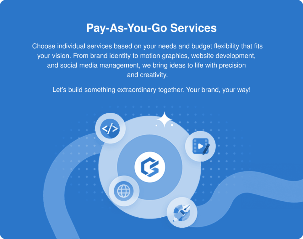 Choose individual services based on your needs and budget flexibility that fits your vision. From brand identity to motion graphics, website development, and social media management, we bring ideas to life with precision and creativity.